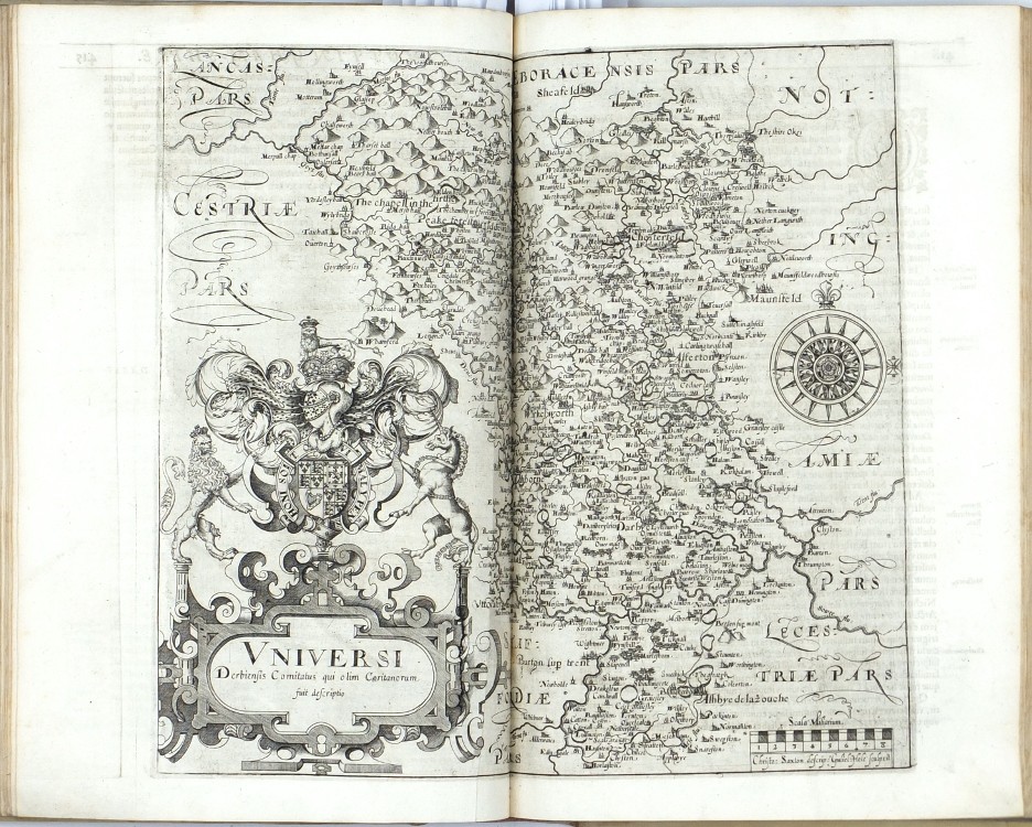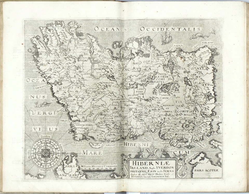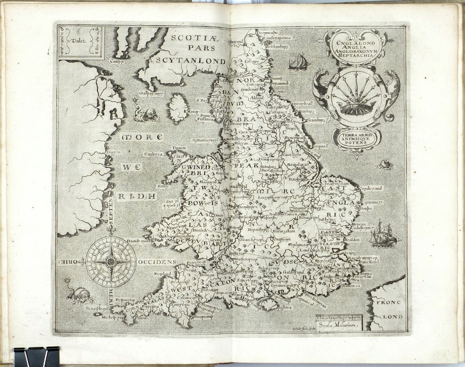 Sixth Latin edition of the great Elizabethan topographical and historical survey of Britain, the last published in Camden's lifetime, and the first to contain the county maps (54 are double-page, 3 are single-page). These were mainly engraved by William Hole (21) or William Kip (34), after the maps of Christopher Saxton (41) or John Norden (6). George Owen contributed Penbrokeshire. The other county maps are unsigned, the general maps of England, Scotland, and Ireland are derived from Mercator. - Map of 'Cambridge' (pp. 354-355) with a brown stain, otherwise very well preserved.