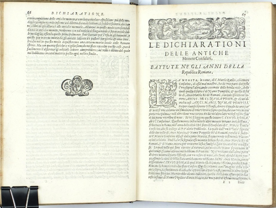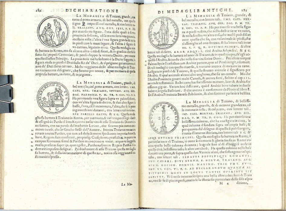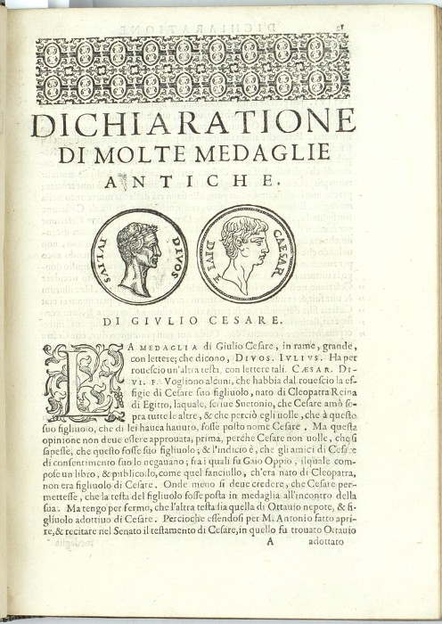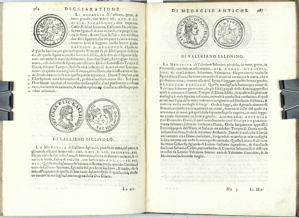Erizzo, Sebastiano. Römische Münzen und Medaillen, Numismatik. "Discorso Di M. Sebastiano Erizzo Sopra le Medaglie de gli Antichi. Con la Dichiaratione delle Monete Consulari, & delle Medaglie de gli Imperadori Romani. Nella qual si contiene vna piena et varia cognitione del'istoria di quei tempi. Di nuouo in questa quarta Editione dall'istesso Authore reuisto, & ampliato". Venedig: Varisco und Paganini, (1584). 8vo. (16), 282, 572 S. mit Holzschnitt-Titelblatt und zahlr. Holzschnitten (Münzen und Medaillen) im Text. Pergamenteinband aus der Zeit mit aristokratischem Supralibros auf Vorder- und Rückseite.
