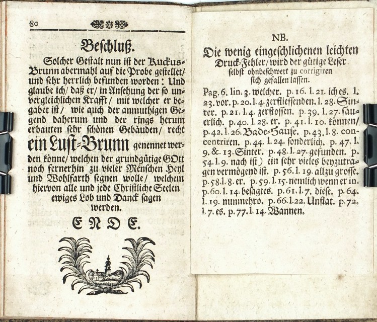 Kuks. Lange, Christian Gottlieb. "Der so alte als edle Kuckus-Brunn ...". Jelenia Góra (Hirschberg): Krahen, 1720. 12°. 80, (1) str. Dobová pap. vazba.