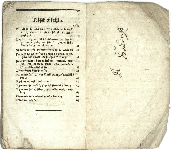 Viz Knihopis K14791 a Jungmann VI. 1491 ('Prwnj nowá hospodářská sskola ...') - variantní tisk s frontispisem (převzatým z německého vydání - 'Die erste Bauernschule in Böhmen, welche zur Erlernung des Bauernhandwerks auf dem von Schönfeldschen Gute Trnowa ...', Praha, Schönfeld, 1791, do češtiny přeložil N. Holauer), upraveným 1. řádkem (zde bez 'nowá') a červeně tištěným 7. řádkem ('... gménem Trnowan ...') titulu. Tuto variantu Knihopis ani Jungmann neuvádějí - nedohledáno, velmi vzácné. - Obálka odřená a zašpiněná, na rubu přední strany obálky zčásti nečitelná signatura, na první nepotištěné straně (rub frontispisu) a na rubu zadní strany obálky stará rukopisná exlibrs, průběžně oslí uši, text čistý. Celkově ještě dobře zachováno.