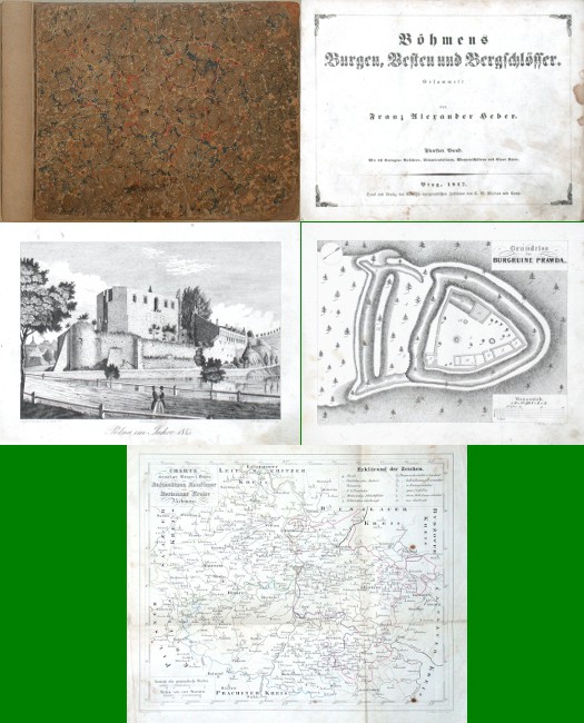 Heber, František Alexander (1815-1849). "Böhmens Burgen, Vesten und Bergschlösser. Fünfter Band." Quer-4°. Prag, C. W. Medau und Comp., 1847. 267, (3) str. s 41 (místo 46) litografickými pohledy, 3 heraldickými lito. tabulemi (každá s 8 šlechtickými erby). Dobová papírová vazba, hřbet odborně vyspraven.