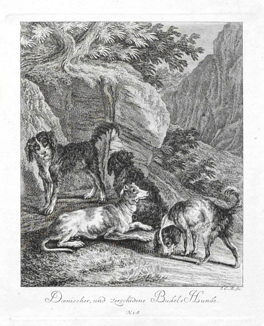 Ridinger, Johann Elias (1698-1767). Hunde. ("Entwurff Einiger Thiere ... Erster Theil ... von denen Arthen der Hunde"). (Augsburg): Ridinger, (1738). 4to. Eine komplette Reihe von 18 Kupferstiche, je. ca. 17:14 cm mit dt. Titel unter dem Bild. Loose Blätter ohne Titel.