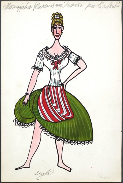 Kostýmní návrh (Marjánka Plajznerová - Plajznerka) pro inscenaci Národního divadla: J. Drda - Dalskabáty, hříšná ves aneb Zapomenutý čert. - Cena s paspartou a rámem (48,5:35 cm).