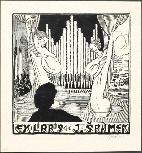 Váchal, Josef (1884-1969). "Ex libris J. Šrámek". Varhaník. Pův. dřevoryt, 1916. Sign. tužkou pod deskou. 12,2:11,8 cm.