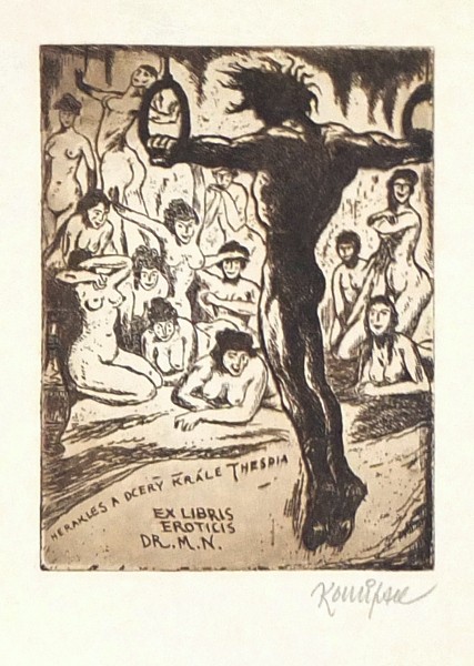 Konůpek, Jan (1883-1950). "Ex Libris Eroticis Dr. M. N. Herakles a dcery krále Thespia" (Miloslav Novotný). Pův. lept, 1927. Signováno tužkou vpravo pod deskou. 12,8:9,6 cm. Tištěno na ručním papíře o rozměrech 21:14,5 cm.