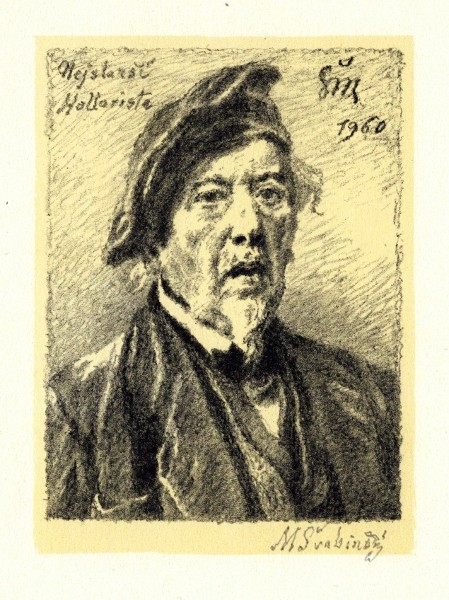 Švabinský, Max (1873-1962). "Nejstarší Hollarista" (Vlastní podobizna v baretu). Pův. litografie s podtiskem, 1960. Lito. sign. a dat. ("ŠM 1960") v desce vpravo nahoře a lito. popsáno vlevo nahoře, tužkou signováno pod obrázkem. 11,3:8,5 cm, žlutý podtisk 12,4:9,2 cm. Jeden ze 60 otisků na tuhém papíře (27,6:20,3 cm).