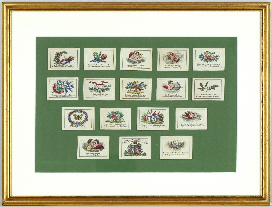 Rudl, Siegmund (1802-1864). Wunschkarten. 17 orig. altkol. Lithografien - Wunschkarten - mit ungarischem Text unter den Bildern. Prag, S. Rudl, um 1840. 17x ca. 3,5:5 cm.