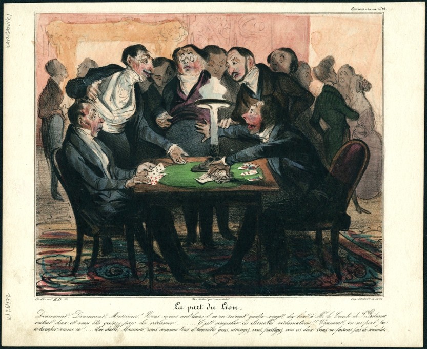 Daumier, Honoré (1808-1879). Kartenspieler. "La part du Lion". Orig. lithograph, 1838. Plate nr. 22 from 'Caricaturana' Series. Orig. old colouring. With title and 3 lines of French text under the picture. 21,5:26,5 cm.