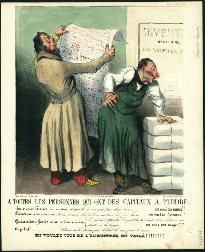 Daumier, Honoré (1808-1879). Finanzbetrug. "A toutes personnes qui ont des capitaux à perdre". Orig. lithograph, 1838. Plate nr. 20 from 'Caricaturana' Series. Orig. old colouring. With title and 6 lines of French text under the picture. 24:21,5 cm.
