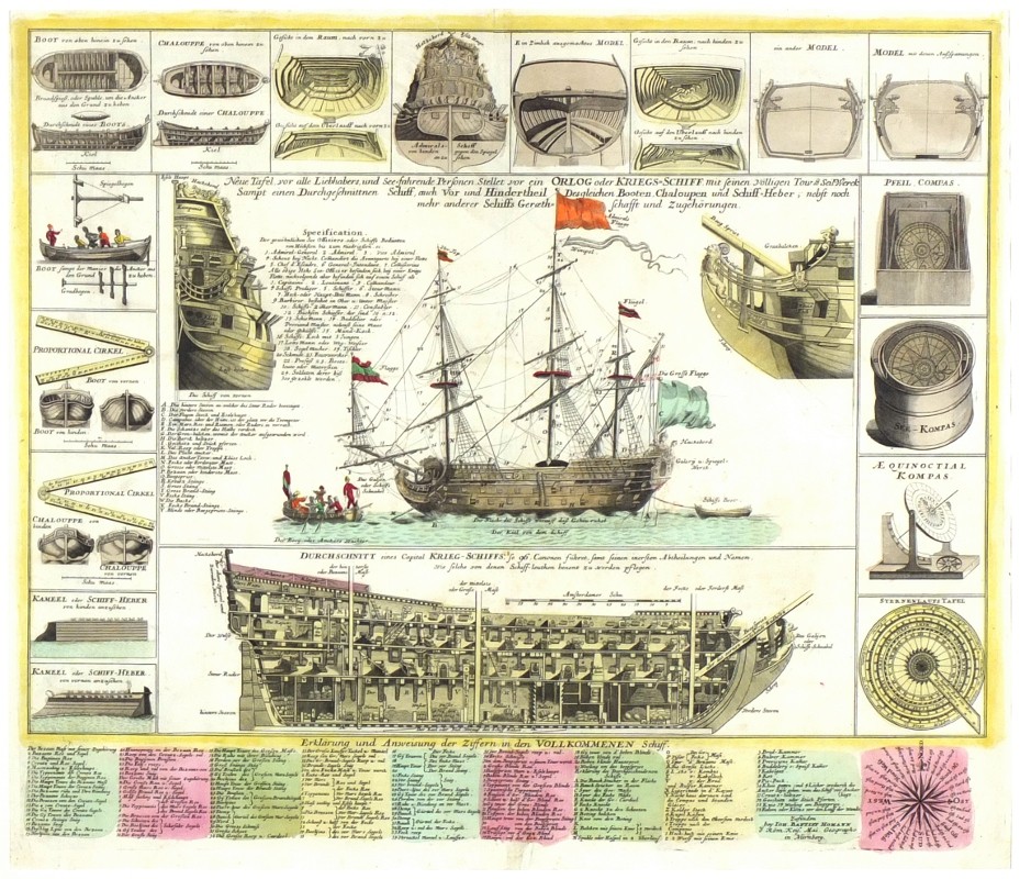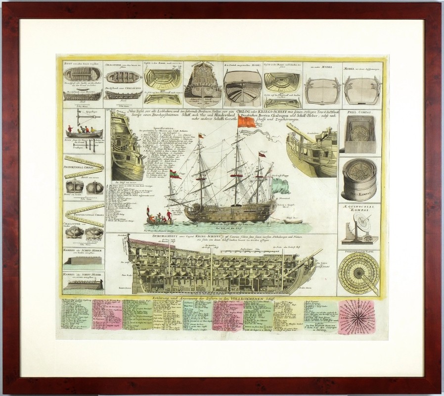 Kriegsschiff. "Neue Tafel, vor alle Liebhabers, und See-fahrende Personen. Stellet vor ein Orlog oder Kriegs-Schiff". Orig. copperplate engraving, J. B. Homann, Nuremberg, ca. 1720. Orig. old coloring. With in the plate, a view of the whole ship with 2 detailed views, a view of the cross-section of the ship with its internal inventory, 12 views of the ship from different sides, 4 compasses and explanatory notes ("Erklärung und Anweisung der Ziffern und Buchstaben in dem Vollkommenen Schiff") under the picture. 48:57 cm.