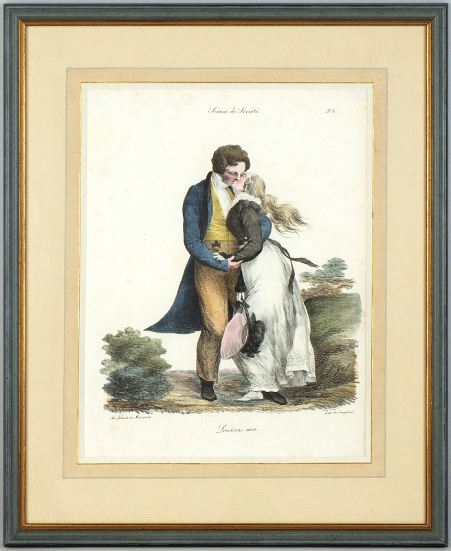 Lass mich! "Laisser-moi" (Liebespaar). Orig. altkol. Kreidelithographie von E. J. Pigal. Gedruckt von P. Langlumé. Bei Gihaut und Martinet in Paris, um 1830. 32:24 cm.