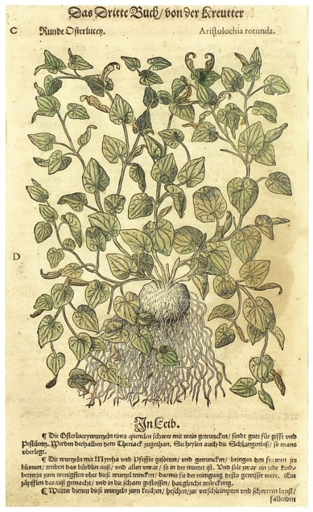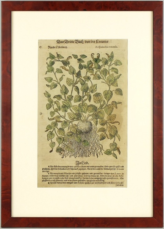 Podražec. "Runde Osterlucey. Aristolochia rotunda". Původní, staře kolorovaný dřevořez z prvního německého vydání P. A. Mattioliho herbáře ('New Kreüterbuch'). Vyd. Melantrich z Aventina v Praze, 1563. S německo-latinským titulem nad obrázkem a něm. textem pod ním. 30:18 cm (výřez pasparty).