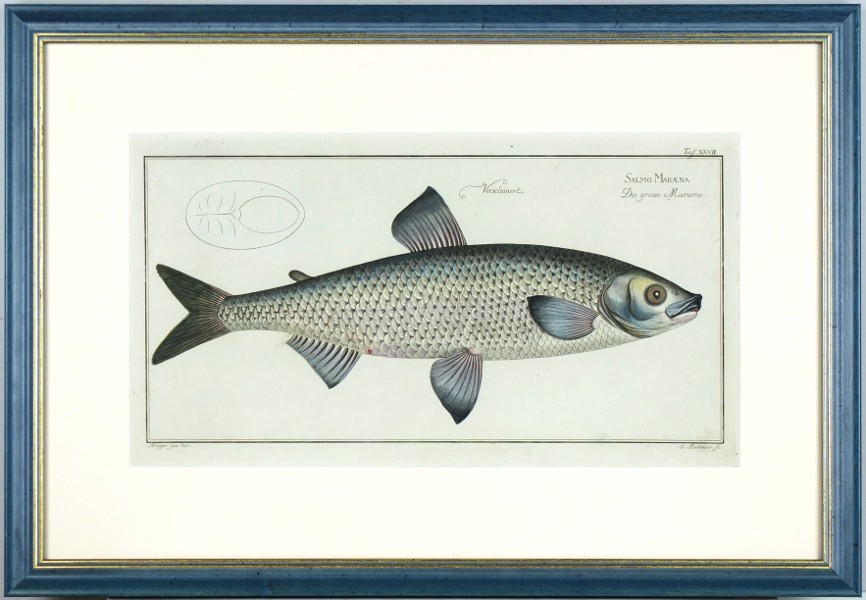 Ostseeschnäpel (Maräne). "Salmo Mareana. Die grosse Maraene". Orig., altkol. Kupferstich, M. E. Bloch, 1784. Gestochen von Bodenehr nach Krüger. 18,5:37 cm.