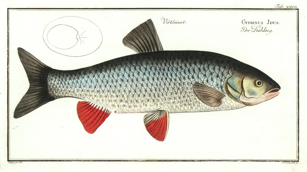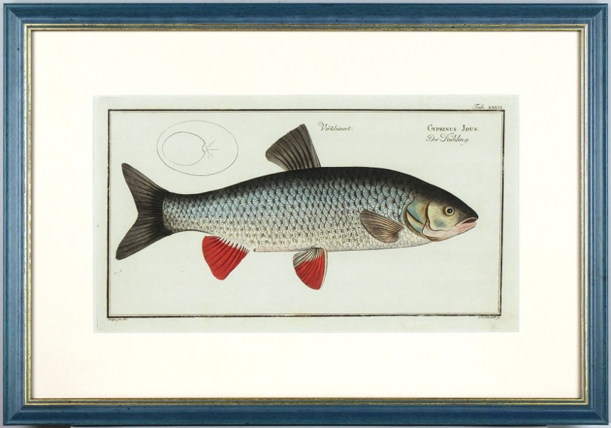 Aland. "Cyprinus Idus. Der Kühling". Orig., altkol. Kupferstich, M. E. Bloch, 1784. Gestochen von Schmidt nach Krüger. 20:37 cm.