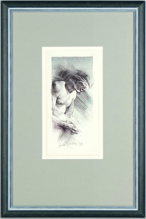 Kulhánek, Oldřich. Mužský poloakt. Původní barevná litografie, 1982. Tužkou signováno a datováno dole uprostřed. 17:8,5 cm na papíře o rozměrech 20:10 cm.