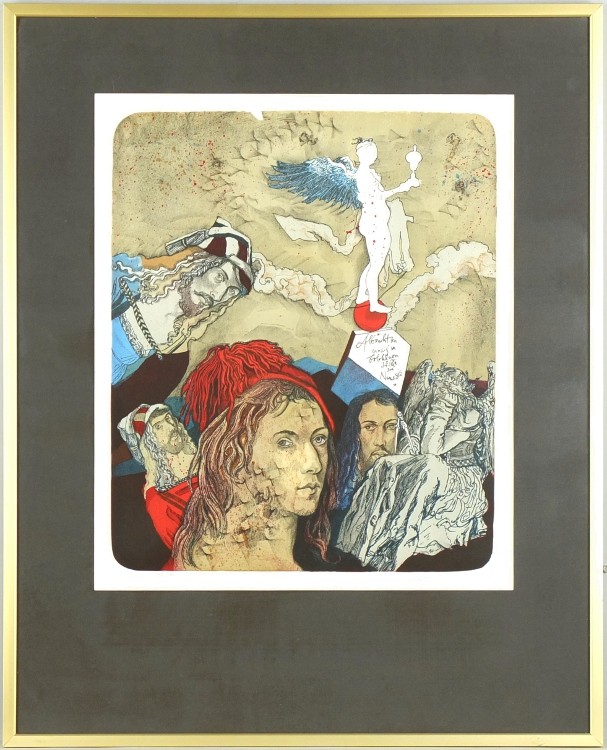 Liesler, Josef (1912-2005). Pocta Dürerovi ("Albrechtku napij se bolehlavu z číše své Nemesis"). Původní barevná litografie, 1980. Tužkou signováno, datováno a číslováno (107/180) pod deskou. 32:25,5 cm.