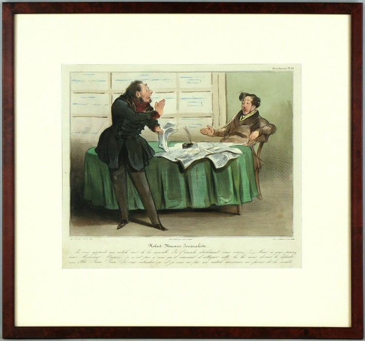 Daumier, Honoré - Philipon, Charles. Robert Macaire - žurnalista. "Robert Macaire Jounaliste". Původní, staře kolorovaná litografie, Aubert, Paříž, 1836-38. Litografoval Daumier podle Philiponovy kresby. List čís. 33 z cyklu 'Caricaturana'. S titulem a 3 řádky francouzského textu pod obrázkem. 19,5:26,5 cm (obrázek).