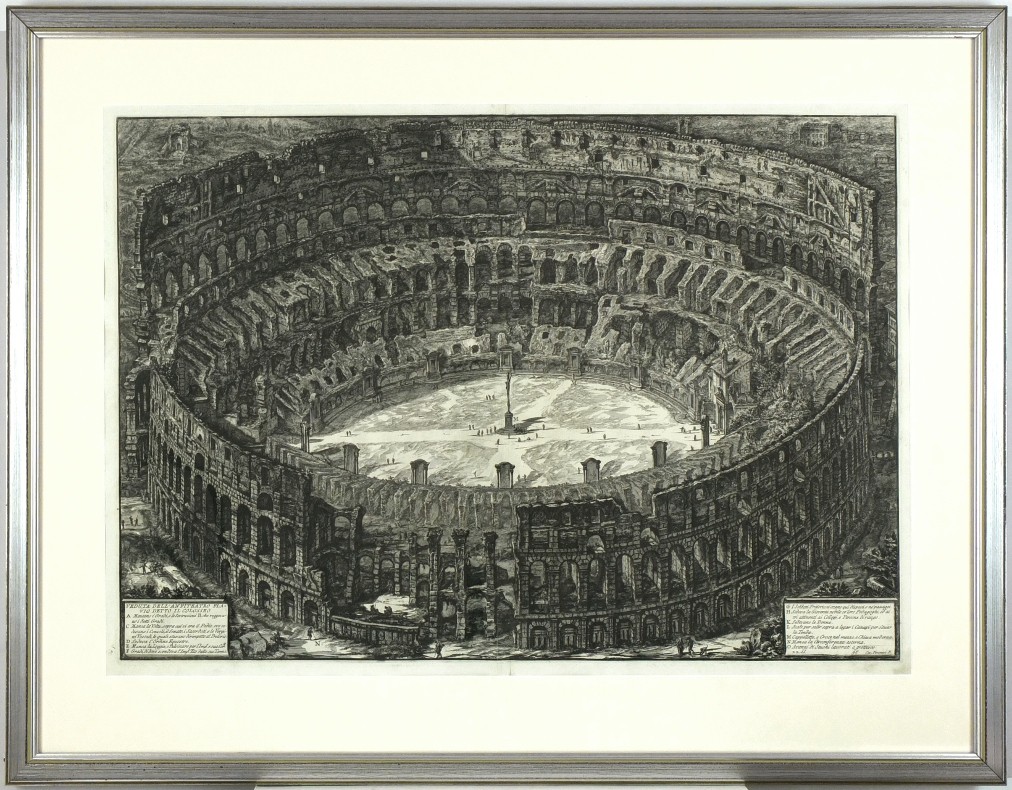 A. M. Hind: 'Giovanni Battista Piranesi. A critical study. With a List of his Published Works', S. 71; Eintrag Nr. 126, II. Stand. - Vogeschauansicht vom Kolosseum in Rom. - Schöner Abdruck auf dickem Bütten. - Preis mit dem Rahmen (70,5:90,5 cm).