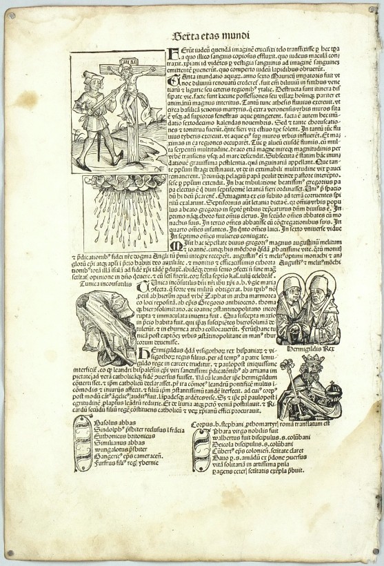 Schedel, Hartmann (1440-1514). "(Folium) CXLIX". Ein Blatt aus dem Schedels Liber Chronicarum (auch Nürnberger Chronik oder Schedelsche Weltchronik). Herausgegeben von A. Koberger in Nürnberg, 1493. Mit insgesamt 8 Holzschnitten von M. Wolgemut (die byzantinischen Kaiser Maurikios und Fokas sowie das Konzil in der Petersbasilika in Rom auf der Vorderseite; ein römischer Soldat, der den gekreuzigten Christus durchbohrt, Blut und Wasser, die aus der Seite Christi spritzen, die Tunika Christi und der heilige Hermenegild auf der Rückseite). 46,5:31 cm.