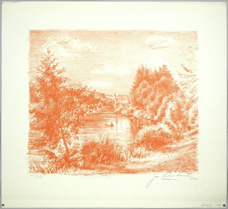 Rambousek, Jan. "Ledečský zámek". Původní litografie, 1944. Lito. signováno ('J. R.') v desce vpravo dole a tužkou signováno, datováno a číslováno (108/250) pod deskou. 31,6:37,5 cm na papíře o rozměrech 46:50 cm se slepotiskovým razítkem nakladatele.