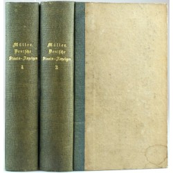 Müller, Adam Heinrich. "Deutsche Staats-Anzeigen. I. - II. Band". Leipzig: Voß, 1816-17. 8vo. 2 Teile in 2 Bände. (4), 595, (1); (4), 611, (1) S., 1 gef. Tafel. HLwd. aus der Zeit mit goldgepr. Rückentitel.