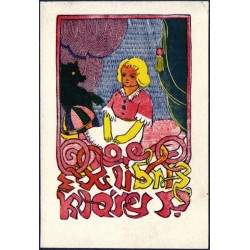 Váchal, Josef. "Ex libris Kláry P.". Panenka, medvídek, míč. Původní tříbarevný dřevoryt, 1911. 10,2:6,7 cm. Otisk na papíře o rozměrech 12,4:8,4 cm.