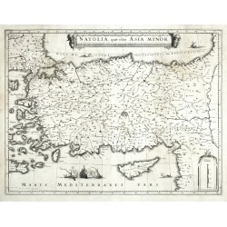 Turkey - Anatolia and Cyprus. "Natolia, quae olim Asia minor". Orig. copperplate engraving, J. Janssonius, Amsterdam, 1636. With decorative title cartouche, a cartouche with the scale of map and 4 ships. 38,5:50 cm.