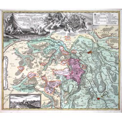 Eichstätt. "Eigentliche Verzeichnung der Gegend und Prospecten der ... Stadt Aichstaedt". Orig. copperplate engraving. Published by Homann Heirs in Nuremberg, 1730. Orig. old colouring. 50:58,5 cm.
