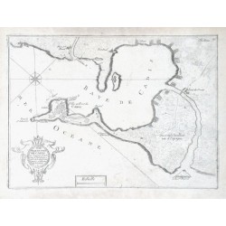 "Isle, Ville et Port de Cadis". Orig. copper-engraving. Published in Paris by N. de Fer, ca. 1695. With ornamental title-cartouche and the scale of map. 21:28,5 cm (8 1/4 x 11 1/4 inch.).