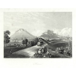 Brno. "Brünn". Původní ocelorytina, A. H. Payne, Lipsko, 1850. S titulem pod obrázkem a figurami a parní lokomotivou v popředí. 11,5:17 cm.