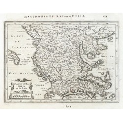Greece, Abania and Macedonia. "Macedonia, Epirus et Achaia". Orig. copper-engraving from the German ed. of Mercator's "Atlas Minor". Published in Amsterdam by J. Janssonius, 1648-52. With ornamental title-cartouche with the scale of map ("Miliaria Italica") and Ger. title ("Macedonia, Epirvs und Achaia") above the map. 14,5:20,5 cm (5 3/4 x 8 inch.).