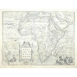 Africa. "Africae Tabula Nova". Orig. copper-engraving. A. Ortelius, Antwerp, 1570. With ornamental title-cartouche, 3 sea-monsters and a depiction of a naval battle. 37,5:50 cm (14 3/4 x 19 3/4 inch.).