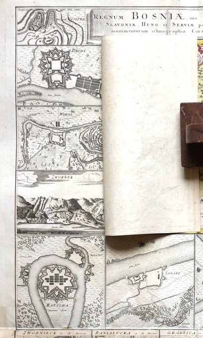 Bosnia, Serbia. "Regnum Bosniae, una cum finitimis Croatiae, Dalmatiae, Slavoniae, Hung. et Serviae partibus, adjuncta praecipuorum in his regionibus ... ichonographia. Regni Serviae Pars, un caum finitimis Valachiae & Bulgariae partibus ...". Orig. copper-egraving, Homann Heirs, 1739. Orig. old colouring. With title at the top. The map is surrounded by 25 city plans/views. With map overlap on the left. Printed from 5 plates, joined. 60:110 cm (23 3/4 x 43 1/4 inch.).