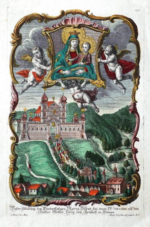 Králíky. "Wahre Abbildung des Wünderthäftigen Maria Bildes bey denen P.P. Serviten auf dem Mütter Gottes Berg bey Krülich in Böhmen". Původní, staře kolorovaný mědiryt, M. Englebrecht, Augsburg, ca. 1740. Pohled na klášter Horu Matky Boží a město s obrazem Panny Marie Sněžné nahoře uprostřed a s rytým něm. titulem pod obrázkem. 29,5:19 cm.