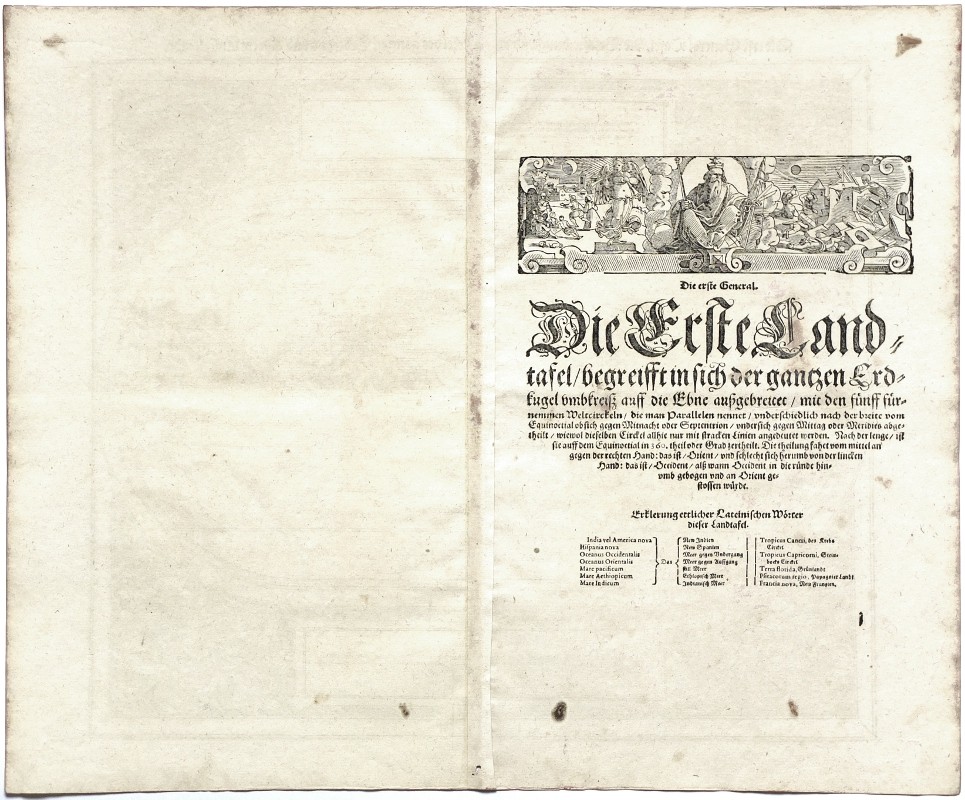The World. "Die erst General Tafel / die Beschreibung und den Circkel des gantzen Erdtrichs und Meers innhaltende". Orig. woodcut from S. Münster's 'Cosmographey; Oder beschreibung aller Länder Herrschafften, und fürnemesten Stetten des gantzen Erdbodens, ... erstlich ... in 6 Büchern verfaßet, ... jetzt aber ... bis in das 1588 Jahr gemehret ...'. Published in Basel by S. Henricpetri, 1588. With German title at the top, 2 cartouches, 2 ships and 3 sea-creatures and decorated corners. 32,5:36 cm (12 3/4 x 14 1/4 inch).