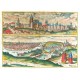 Prague. "Praga Regni Bohemiae metropolis. Palatium Imperatorum Pragae quod vulgo Ratzin appellatur". Orig. copper-engraving from Braun & Hogenberg, Cologne, 1596. Orig. old colouring. View of Prague from Letna at the bottom and a Prague Castle panorama above it. With two figures and two engraved titles. 36,5:49 cm.