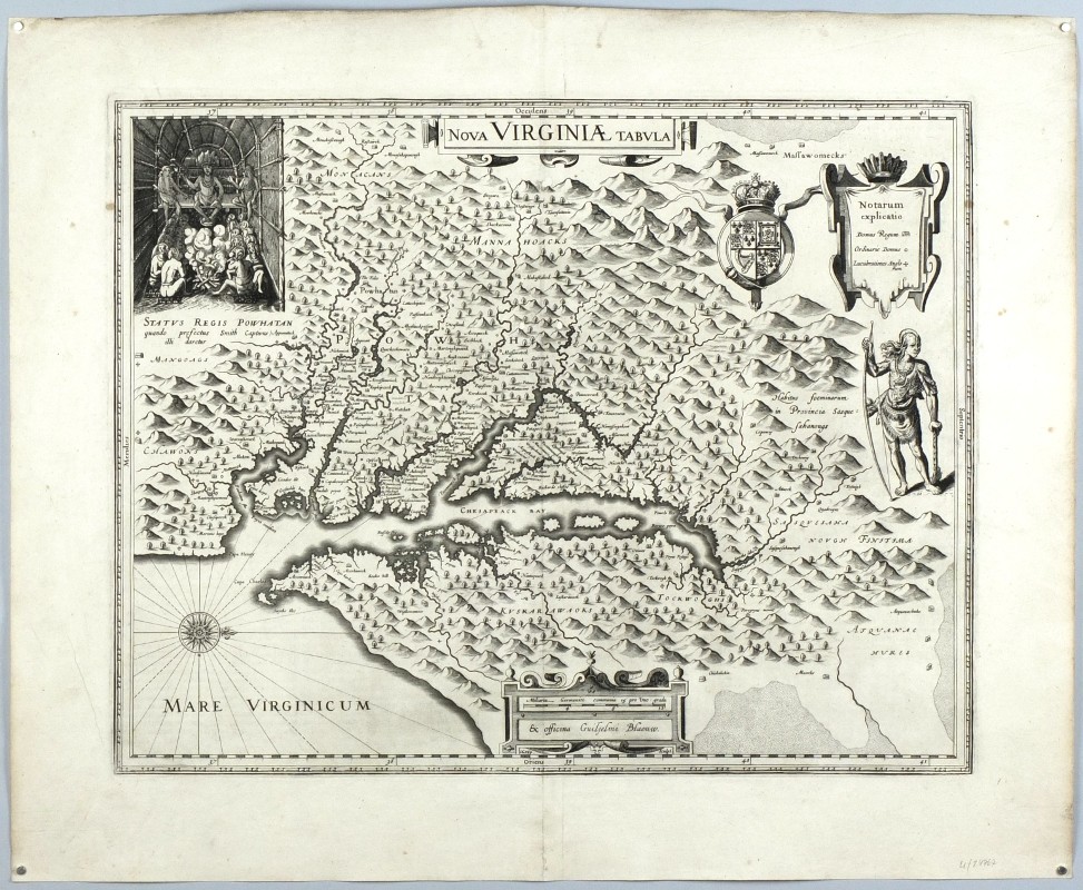 Virginia. "Nova Virginiae tabula". Orig. copperplate engraving, W. J. Blaeu, Amsterdam, 1630 from German edition of his 'Theatrum Orbis Terrarum - Novus Atlas', 1634. Engraved by D. Grijp after captain J. Smith map. With ornamental title cartouche, another ornament. cartouche with the scale of map ("Miliaria Germanica communia 15 pro Uno gradu"), a cartouche with explanatory notes ("Notarum explicatio"), great coat of arms, a wind-rose, a depiction of an Indian and of "Satus Regis Powhatan" (Virginia Indian tribe). 37,5:48 cm (14 3/4 x 19 inch.).