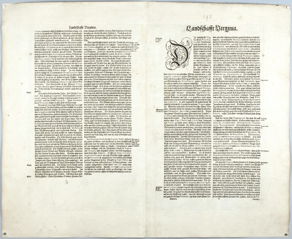 Koeman II, map 9410:2.2, ed. 2:131 (1634 German); Burden 193, state 2. - The map is the first and most important derivative of John Smith's map of Virginia originally published in 1612. Oriented to the West. - Nice rich impression printed on paper with wide margins (48:59 cm; 19 x 13 1/4 inch.).
