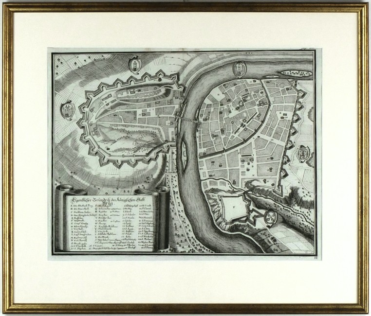Praha. "Eigentlicher Grundriß der Königlichen Statt Prag". Původní mědirytina z J. G. Vogt, "Das jetzt-lebende Königreich Böhmen". Vyd. J. Ziegern ve Frankfurtu n. Mohanem a Lipsku, 1712. S tit. kartuší s vysvětlivkami a 5 erby. 29:38 cm.