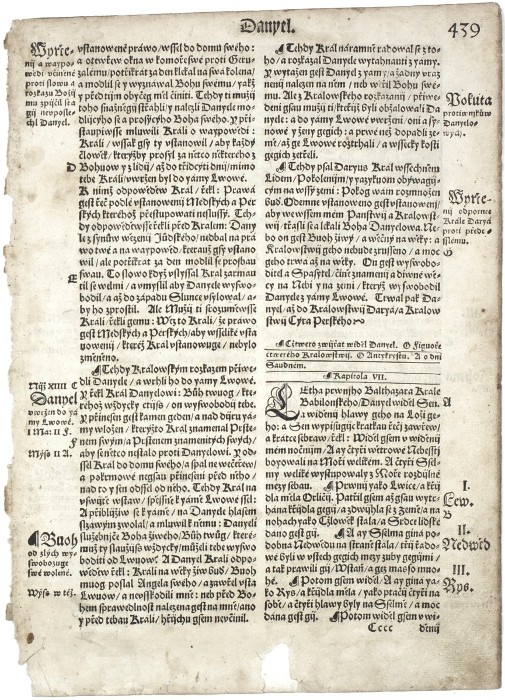 Map of the World. (Daniel's Dream Map). Original woodcut after F. Terzio's drawing (monogram 'TF' at thoe bottom of the map) from Czech Bible printed by J. Melantrich in Prague, 1570. 12,3:17,5 cm.