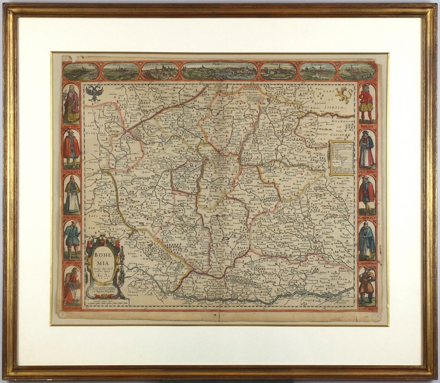 Čechy. "Bohemia Newly described by Iohn Speed Anno Dom: 1626". Původní, staře kolorovaná mědirytina, J. Speed, 1626. Vyd. R. Chiswell & T. Bassett v Londýně, 1676. S ornamentální titulní kartuší, další ornament. kartuší s vysvětlivkami ("The explicatien of y notes"), českým lvem a německou orlicí v horních rozích mapy. Nad mapou lišta s 5 důležitými českými městy tehdejší doby (Čáslav, Chomutov, Praha, Polná, Slaný, Louny) a Hradčany, po stranách lišty s postavami různých stavů v dobových krojích. 42:53 cm.