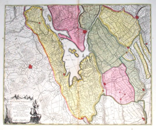 Southeast Holland. "Hollandiae Meridionalis Pars II. continens novissimam Insularum Dordracensis, Alblasser, Crimper et Clundert". Orig. copperplate engraving published by Janssonius-Waesberge, M. Pitt and S. Swart, ca. 1680. Original old colouring. With figure cartouche by Joh. vanden Avele. 45:55 cm (17 3/4 x 21 3/4 inch.).