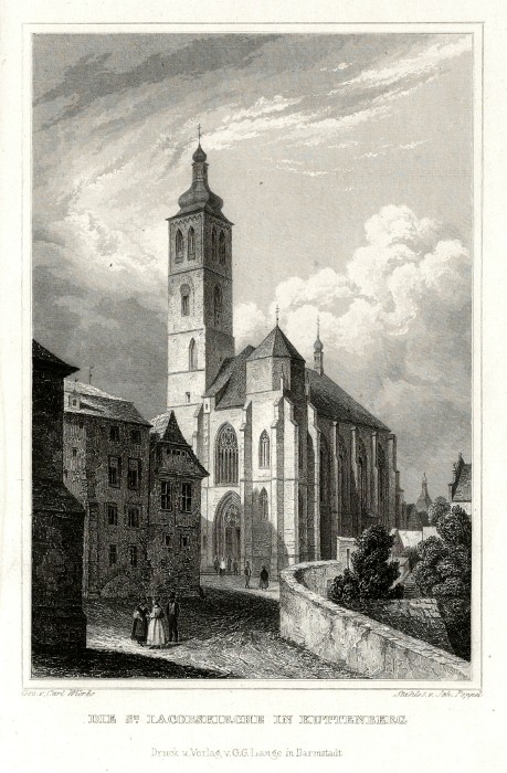 Kutná Hora. "Die St. Iacobskirche in Kuttenberg". Pův. oceloryt. Podle C. Würbse ryl J. Poppel, vyd. G. G. Lange v Darmstadtu, ca. 1835. 15,5:10,5 cm.