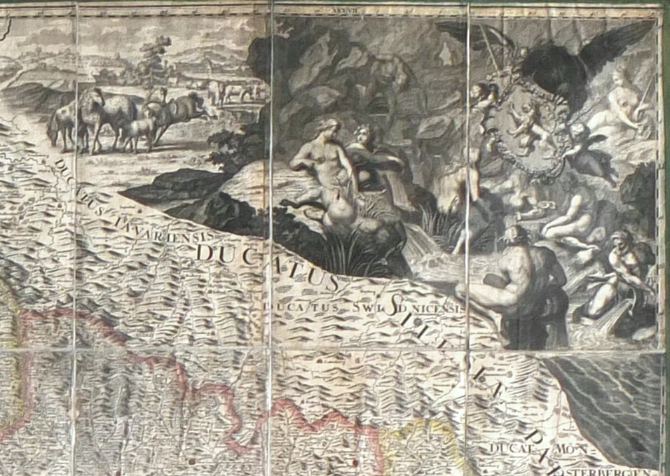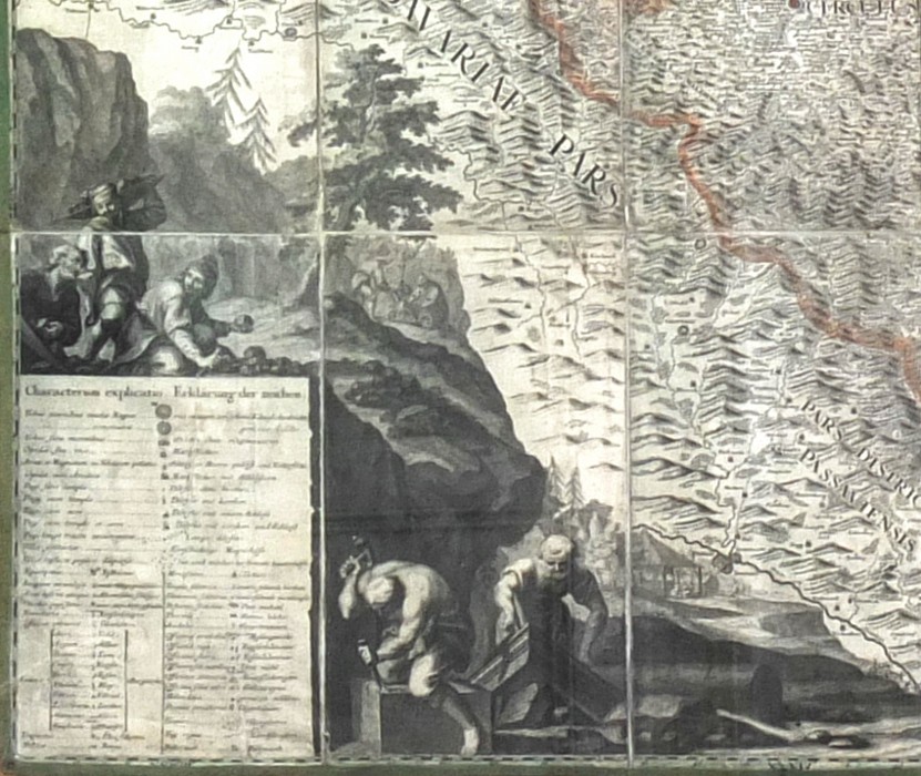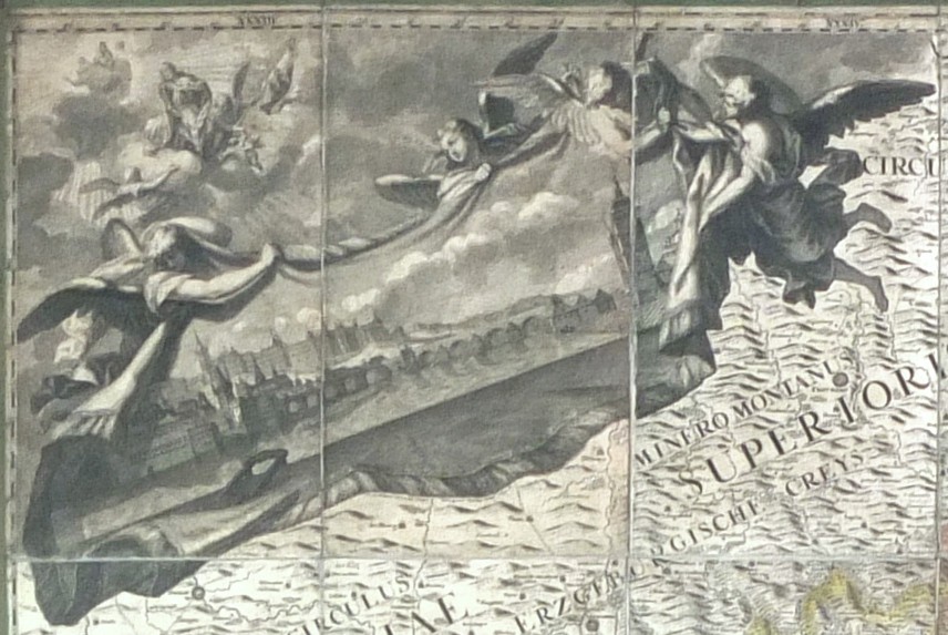V levém horním rohu pohled na Pražský hrad s Karlovým mostem, vpravo nahoře český lev obklopený alegoriemi hlavních českých řek, vlevo dole legenda ("Characterum explicatio - Erklärung der Zeichen") umístěná do skály s výjevy práce kameníků a vpravo dole velký ozdobný titul s rohy hojnosti a motivy mj. vinařství a chmelařství. - Cena s paspartou a rámem (155:176 cm).