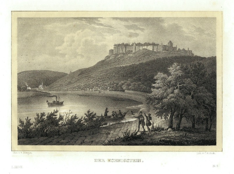 Sächsische Schweiz - Festung Königstein. "Der Koenigstein". Orig. getönte Lithografie mit Unterdruck von C. W. Arldt nach R. Bürger. Aus: C. G. Semmler - 'Der Elbstrom, von seinem Ursprunge bis zu seiner Mündung in die Nordsee ...'. Dresden: Semmler, 1845. Mit Figuren, Schiffe auf der Elbe im Vordergrund und litho. Titel unten. 16:24 cm.