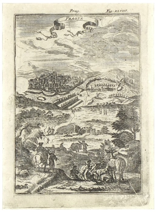 Praha. "Prague". Původní mědirytina, 1683. Z: A. M. Mallet - 'Beschreibung des gantzen Weltkeris'. Vyd. J. A. Jung ve Frankfurtu nad Mohanem, 1719. S tit. kartuší nahoře a figurami v popředí. 14:9,5 cm.