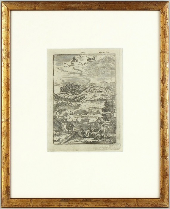 Praha. "Prague". Původní mědirytina, 1683. Z: A. M. Mallet - 'Beschreibung des gantzen Weltkeris'. Vyd. J. A. Jung ve Frankfurtu nad Mohanem, 1719. S titulem v dekorativní kartuši nahoře a figurami s koňmi v popředí. 14:9,5 cm.