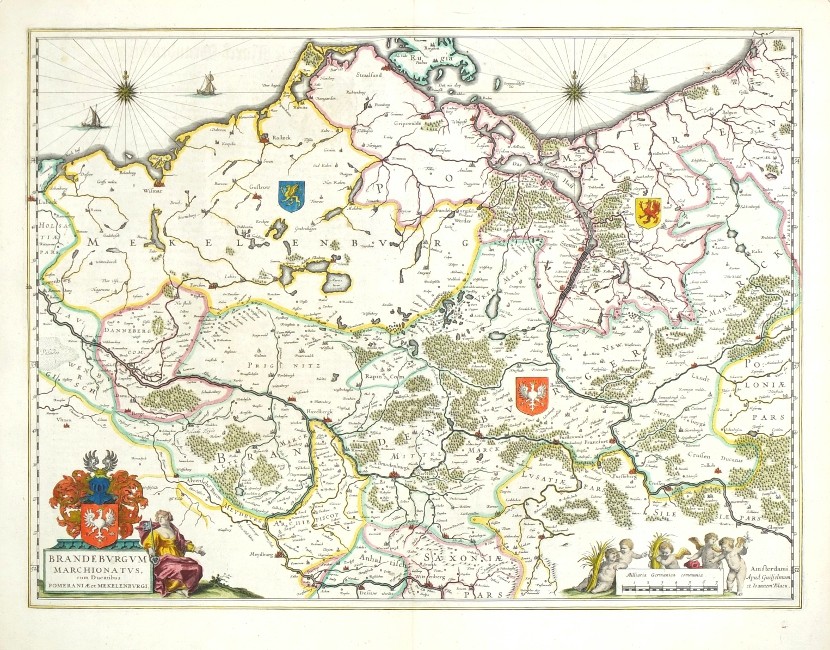 Brandenburg, Mecklenburg, Berlin. "Brandenburgum Marchionatus, cum Ducatibus Pomeraniae et Mekelenburgi". Orig. copperplate engraving, W. J. Blaeu, 1631. Published by W. and J. Blaeu in Amsterdam, 1641. Orig. old colouring. With figure title cartouche with a coat of arms, another cartouche with the scale of map and 4 cherubs, 3 smaller coats of arms in the map, 2 windroses and 3 shipse. 39,5:52,5 cm on paper sized 48:58 cm.