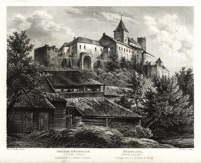Křivoklát. "Hrádek Křivoklád. (Druhý obraz)". Pův. ocelorytina. Podle W. Kandlerovy kresby ryl A. Fesca. Vydal I. L. Kober v Praze, 1865. S čes.-něm. titulem pod obrázkem. 13,5:18 cm (obrázek).