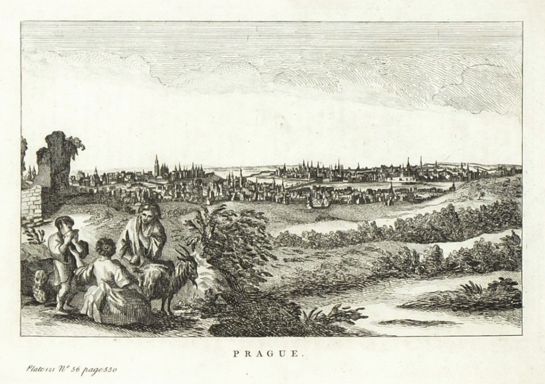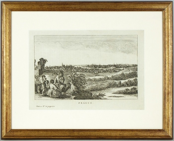 Praha. "Prague". Původní lept, ca. 1660 podle Hollarova prospeku Prahy z toku 1649. S rytým titulem pod obrázkem a figurami v popředí. 16:25,5 cm (obrázek).